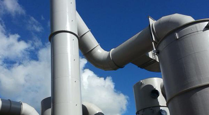 The system below comprises an ammonia scrubber, a hypo scrubber (to remove H2S and sulphonated compounds), duty and standby exhaust fans and an adsorber with a free-standing 35m stack. The system’s volume flowrate is 60,000 m3/h.